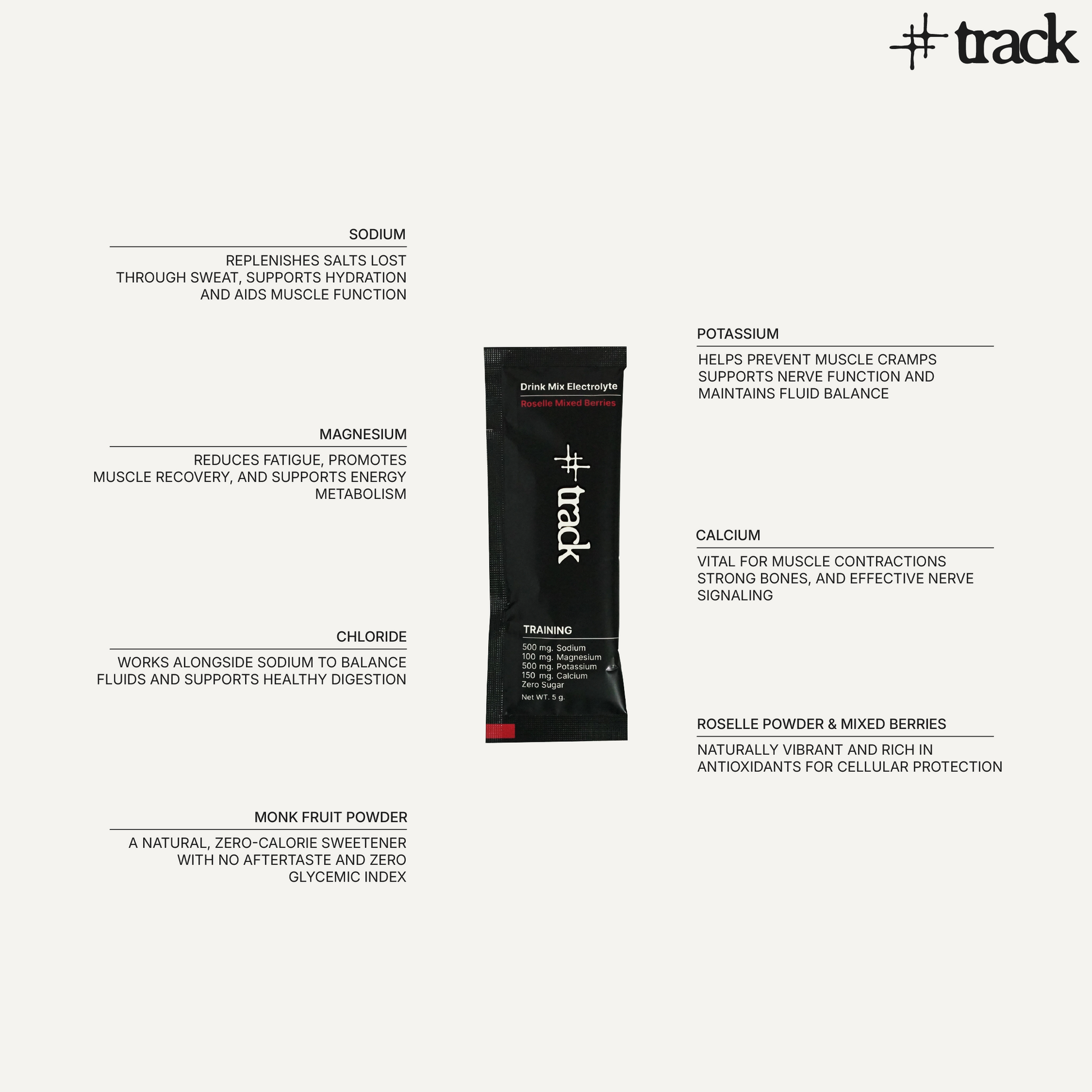 Track Electrolyte Drink Mix – Training Formula is designed to replenish electrolyte loss during moderate to high-intensity exercise. It contains five essential electrolytes your body needs: sodium, magnesium, potassium, chloride,and calcium—with zero sugar.